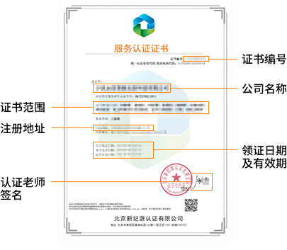 主要有證書編號、公司名稱、證書范圍、注冊地址、領證日期及有效期、發證機構名稱